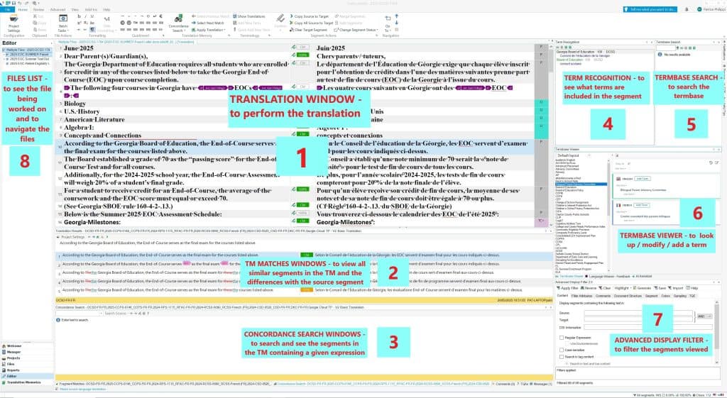 Well done, you have now all the windows grouped by subject – Translation Memories and Termbases, all visibles. Furthermore, you can easily filter the segments or navigage between files. In short, your Trados translation board is fine tuned for maximum efficiency.